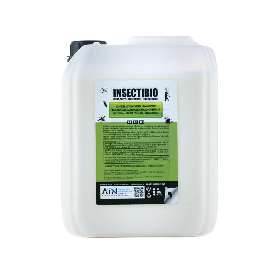 Insecticide, larvicide végétal biodégradable. Solution concentrée aqueuse et limpide à base d’huiles essentielles 100 % pures et hydro-solubilisées.
